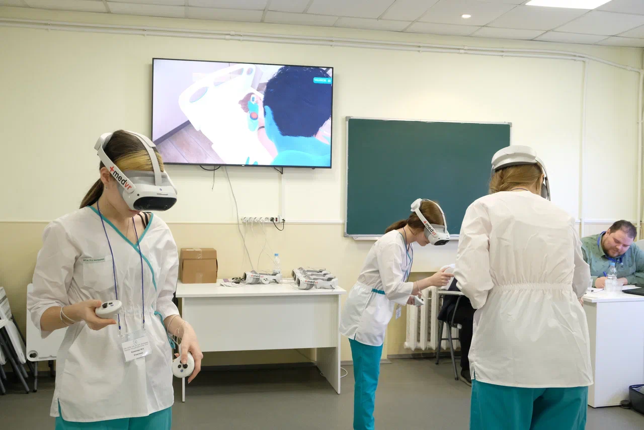 Эксперты конкурса протестировали VR-очки для медицинских колледжей. Отметим, что VR-очки для медицинских колледжей — это инструменты симуляционного обучения, позволяющие студентам отрабатывать навыки оказания неотложной помощи, анатомии и хирургии в безопасной виртуальной среде. Основные направления применения VR-очков: